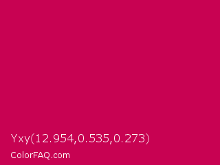 Yxy 12.954,0.535,0.273 Color is a normal rose color and the nearest color is Rubine Red #d10056. Hex code #c80252 and RGB value is rgb(200,2,82). In RGB color space, this color is composed of 78% red, 1% green, 32% blue, In CMYK color space, this color is composed of 0% cyan, 99% magenta, 59% yellow , 22% black , In HSL color space, this color has a hue angle of 336° , 98% saturation and 40% lightness.