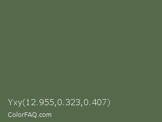 Yxy 12.955,0.323,0.407 Color is a normal green color and the nearest color is Axolotl #4e6649. Hex code #556b4b and RGB value is rgb(85,107,75). In RGB color space, this color is composed of 33% red, 42% green, 29% blue, In CMYK color space, this color is composed of 21% cyan, 0% magenta, 30% yellow , 58% black , In HSL color space, this color has a hue angle of 101° , 18% saturation and 36% lightness.