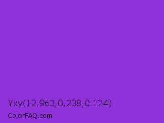 Yxy 12.963,0.238,0.124 Color is a normal purple color and the nearest color is Blue Violet #8a2be2. Hex code #8f30d9 and RGB value is rgb(143,48,217). In RGB color space, this color is composed of 56% red, 19% green, 85% blue, In CMYK color space, this color is composed of 34% cyan, 78% magenta, 0% yellow , 15% black , In HSL color space, this color has a hue angle of 274° , 69% saturation and 52% lightness.