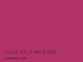 Yxy 12.971,0.447,0.259 Color is a normal rose color and the nearest color is Hibiscus #b6316c. Hex code #b33269 and RGB value is rgb(179,50,105). In RGB color space, this color is composed of 70% red, 20% green, 41% blue, In CMYK color space, this color is composed of 0% cyan, 72% magenta, 41% yellow , 30% black , In HSL color space, this color has a hue angle of 334° , 56% saturation and 45% lightness.