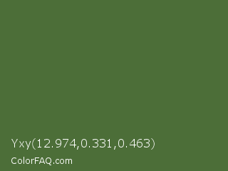 Yxy 12.974,0.331,0.463 Color is a normal green color and the nearest color is Chalet Green #516e3d. Hex code #4c6e38 and RGB value is rgb(76,110,56). In RGB color space, this color is composed of 30% red, 43% green, 22% blue, In CMYK color space, this color is composed of 31% cyan, 0% magenta, 49% yellow , 57% black , In HSL color space, this color has a hue angle of 98° , 33% saturation and 33% lightness.