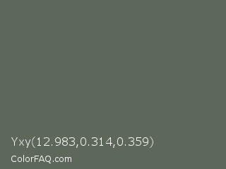 Yxy 12.983,0.314,0.359 Color is a normal green color and the nearest color is Siam #646a54. Hex code #5d685b and RGB value is rgb(93,104,91). In RGB color space, this color is composed of 36% red, 41% green, 36% blue, In CMYK color space, this color is composed of 11% cyan, 0% magenta, 13% yellow , 59% black , In HSL color space, this color has a hue angle of 111° , 7% saturation and 38% lightness.