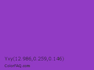 Yxy 12.986,0.259,0.146 Color is a normal purple color and the nearest color is Dark Orchid #9932cc. Hex code #913ac3 and RGB value is rgb(145,58,195). In RGB color space, this color is composed of 57% red, 23% green, 76% blue, In CMYK color space, this color is composed of 26% cyan, 70% magenta, 0% yellow , 24% black , In HSL color space, this color has a hue angle of 278° , 54% saturation and 50% lightness.