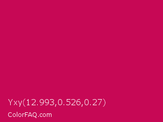 Yxy 12.993,0.526,0.27 Color is a normal rose color and the nearest color is Pictorial Carmine #c30b4e. Hex code #c70855 and RGB value is rgb(199,8,85). In RGB color space, this color is composed of 78% red, 3% green, 33% blue, In CMYK color space, this color is composed of 0% cyan, 96% magenta, 57% yellow , 22% black , In HSL color space, this color has a hue angle of 336° , 92% saturation and 41% lightness.