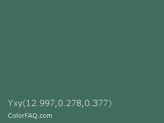 Yxy 12.997,0.278,0.377 Color is a normal green color and the nearest color is Amazon #3b7a57. Hex code #406e5b and RGB value is rgb(64,110,91). In RGB color space, this color is composed of 25% red, 43% green, 36% blue, In CMYK color space, this color is composed of 42% cyan, 0% magenta, 17% yellow , 57% black , In HSL color space, this color has a hue angle of 155° , 26% saturation and 34% lightness.
