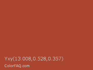 Yxy 13.008,0.528,0.357 Color is a normal red color and the nearest color is Medium Carmine #af4035. Hex code #aa452f and RGB value is rgb(170,69,47). In RGB color space, this color is composed of 67% red, 27% green, 18% blue, In CMYK color space, this color is composed of 0% cyan, 59% magenta, 72% yellow , 33% black , In HSL color space, this color has a hue angle of 11° , 57% saturation and 43% lightness.