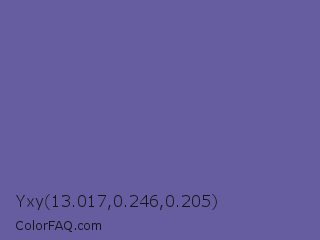 Yxy 13.017,0.246,0.205 Color is a normal indigo color and the nearest color is Scampi #675fa6. Hex code #665ca0 and RGB value is rgb(102,92,160). In RGB color space, this color is composed of 40% red, 36% green, 63% blue, In CMYK color space, this color is composed of 36% cyan, 43% magenta, 0% yellow , 37% black , In HSL color space, this color has a hue angle of 249° , 27% saturation and 49% lightness.
