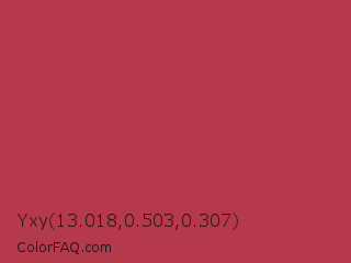Yxy 13.018,0.503,0.307 Color is a normal red color and the nearest color is Night Shadz #aa375a. Hex code #b3394b and RGB value is rgb(179,57,75). In RGB color space, this color is composed of 70% red, 22% green, 29% blue, In CMYK color space, this color is composed of 0% cyan, 68% magenta, 58% yellow , 30% black , In HSL color space, this color has a hue angle of 351° , 52% saturation and 46% lightness.