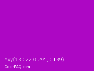 Yxy 13.022,0.291,0.139 Color is a normal magenta color and the nearest color is Heliotrope Magenta #aa00bb. Hex code #ad07c4 and RGB value is rgb(173,7,196). In RGB color space, this color is composed of 68% red, 3% green, 77% blue, In CMYK color space, this color is composed of 12% cyan, 96% magenta, 0% yellow , 23% black , In HSL color space, this color has a hue angle of 293° , 93% saturation and 40% lightness.