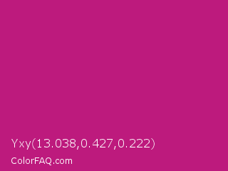 Yxy 13.038,0.427,0.222 Color is a normal magenta color and the nearest color is Red Violet #c71585. Hex code #bd1a7d and RGB value is rgb(189,26,125). In RGB color space, this color is composed of 74% red, 10% green, 49% blue, In CMYK color space, this color is composed of 0% cyan, 86% magenta, 34% yellow , 26% black , In HSL color space, this color has a hue angle of 324° , 76% saturation and 42% lightness.
