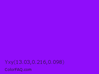 Yxy 13.03,0.216,0.098 Color is a normal purple color and the nearest color is Electric Violet #8f00ff. Hex code #8f0dfa and RGB value is rgb(143,13,250). In RGB color space, this color is composed of 56% red, 5% green, 98% blue, In CMYK color space, this color is composed of 43% cyan, 95% magenta, 0% yellow , 2% black , In HSL color space, this color has a hue angle of 273° , 96% saturation and 52% lightness.