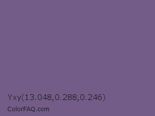 Yxy 13.048,0.288,0.246 Color is a normal purple color and the nearest color is Rum #796989. Hex code #735c87 and RGB value is rgb(115,92,135). In RGB color space, this color is composed of 45% red, 36% green, 53% blue, In CMYK color space, this color is composed of 15% cyan, 32% magenta, 0% yellow , 47% black , In HSL color space, this color has a hue angle of 272° , 19% saturation and 45% lightness.