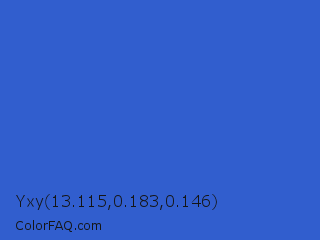 Yxy 13.115,0.183,0.146 Color is a normal blue color and the nearest color is Mariner #286acd. Hex code #315ece and RGB value is rgb(49,94,206). In RGB color space, this color is composed of 19% red, 37% green, 81% blue, In CMYK color space, this color is composed of 76% cyan, 54% magenta, 0% yellow , 19% black , In HSL color space, this color has a hue angle of 223° , 62% saturation and 50% lightness.