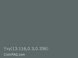 Yxy 13.116,0.3,0.336 Color is a normal cyan color and the nearest color is Corduroy #606e68. Hex code #5c6865 and RGB value is rgb(92,104,101). In RGB color space, this color is composed of 36% red, 41% green, 40% blue, In CMYK color space, this color is composed of 12% cyan, 0% magenta, 3% yellow , 59% black , In HSL color space, this color has a hue angle of 165° , 6% saturation and 38% lightness.