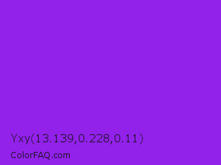 Yxy 13.139,0.228,0.11 Color is a normal purple color and the nearest color is Blue Violet #8a2be2. Hex code #9221ea and RGB value is rgb(146,33,234). In RGB color space, this color is composed of 57% red, 13% green, 92% blue, In CMYK color space, this color is composed of 38% cyan, 86% magenta, 0% yellow , 8% black , In HSL color space, this color has a hue angle of 274° , 83% saturation and 52% lightness.