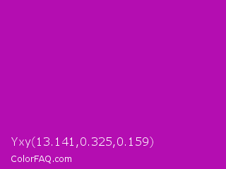 Yxy 13.141,0.325,0.159 Color is a normal magenta color and the nearest color is Heliotrope Magenta #aa00bb. Hex code #b40db1 and RGB value is rgb(180,13,177). In RGB color space, this color is composed of 71% red, 5% green, 69% blue, In CMYK color space, this color is composed of 0% cyan, 93% magenta, 2% yellow , 29% black , In HSL color space, this color has a hue angle of 301° , 87% saturation and 38% lightness.
