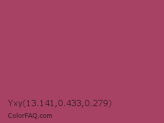 Yxy 13.141,0.433,0.279 Color is a normal rose color and the nearest color is Medium Ruby #aa4069. Hex code #a84264 and RGB value is rgb(168,66,100). In RGB color space, this color is composed of 66% red, 26% green, 39% blue, In CMYK color space, this color is composed of 0% cyan, 61% magenta, 40% yellow , 34% black , In HSL color space, this color has a hue angle of 340° , 44% saturation and 46% lightness.