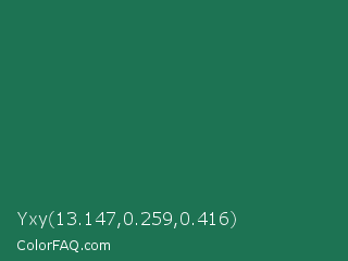 Yxy 13.147,0.259,0.416 Color is a dark green color and the nearest color is Dark Spring Green #177245. Hex code #1d7353 and RGB value is rgb(29,115,83). In RGB color space, this color is composed of 11% red, 45% green, 33% blue, In CMYK color space, this color is composed of 75% cyan, 0% magenta, 28% yellow , 55% black , In HSL color space, this color has a hue angle of 158° , 60% saturation and 28% lightness.