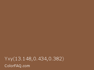 Yxy 13.148,0.434,0.382 Color is a normal orange color and the nearest color is Potters Clay #8c5738. Hex code #895b3e and RGB value is rgb(137,91,62). In RGB color space, this color is composed of 54% red, 36% green, 24% blue, In CMYK color space, this color is composed of 0% cyan, 34% magenta, 55% yellow , 46% black , In HSL color space, this color has a hue angle of 23° , 38% saturation and 39% lightness.