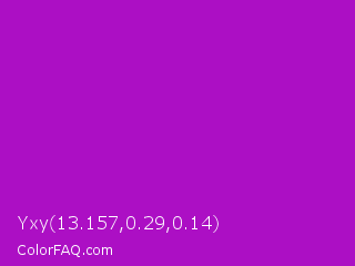 Yxy 13.157,0.29,0.14 Color is a normal magenta color and the nearest color is Heliotrope Magenta #aa00bb. Hex code #ac0fc4 and RGB value is rgb(172,15,196). In RGB color space, this color is composed of 67% red, 6% green, 77% blue, In CMYK color space, this color is composed of 12% cyan, 92% magenta, 0% yellow , 23% black , In HSL color space, this color has a hue angle of 292° , 86% saturation and 41% lightness.