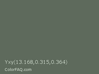 Yxy 13.168,0.315,0.364 Color is a normal green color and the nearest color is Siam #646a54. Hex code #5d695a and RGB value is rgb(93,105,90). In RGB color space, this color is composed of 36% red, 41% green, 35% blue, In CMYK color space, this color is composed of 11% cyan, 0% magenta, 14% yellow , 59% black , In HSL color space, this color has a hue angle of 108° , 8% saturation and 38% lightness.