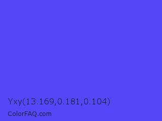 Yxy 13.169,0.181,0.104 Color is a light indigo color and the nearest color is Majorelle Blue #6050dc. Hex code #5447f9 and RGB value is rgb(84,71,249). In RGB color space, this color is composed of 33% red, 28% green, 98% blue, In CMYK color space, this color is composed of 66% cyan, 71% magenta, 0% yellow , 2% black , In HSL color space, this color has a hue angle of 244° , 94% saturation and 63% lightness.