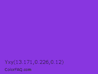Yxy 13.171,0.226,0.12 Color is a normal violet color and the nearest color is Blue Violet #8a2be2. Hex code #8736e0 and RGB value is rgb(135,54,224). In RGB color space, this color is composed of 53% red, 21% green, 88% blue, In CMYK color space, this color is composed of 40% cyan, 76% magenta, 0% yellow , 12% black , In HSL color space, this color has a hue angle of 269° , 73% saturation and 55% lightness.