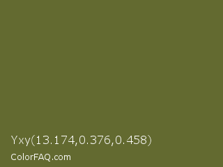 Yxy 13.174,0.376,0.458 Color is a dark yellow color and the nearest color is Costa Del Sol #615d30. Hex code #636a30 and RGB value is rgb(99,106,48). In RGB color space, this color is composed of 39% red, 42% green, 19% blue, In CMYK color space, this color is composed of 7% cyan, 0% magenta, 55% yellow , 58% black , In HSL color space, this color has a hue angle of 67° , 38% saturation and 30% lightness.