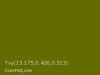 Yxy 13.175,0.406,0.513 Color is a very dark yellow color and the nearest color is Bronze Yellow #737000. Hex code #636b03 and RGB value is rgb(99,107,3). In RGB color space, this color is composed of 39% red, 42% green, 1% blue, In CMYK color space, this color is composed of 7% cyan, 0% magenta, 97% yellow , 58% black , In HSL color space, this color has a hue angle of 65° , 95% saturation and 22% lightness.
