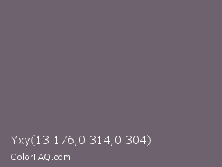 Yxy 13.176,0.314,0.304 Color is a normal magenta color and the nearest color is Salt Box #685e6e. Hex code #6e626e and RGB value is rgb(110,98,110). In RGB color space, this color is composed of 43% red, 38% green, 43% blue, In CMYK color space, this color is composed of 0% cyan, 11% magenta, 0% yellow , 57% black , In HSL color space, this color has a hue angle of 300° , 6% saturation and 41% lightness.