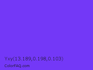 Yxy 13.189,0.198,0.103 Color is a normal indigo color and the nearest color is Blue Violet #8a2be2. Hex code #7338f7 and RGB value is rgb(115,56,247). In RGB color space, this color is composed of 45% red, 22% green, 97% blue, In CMYK color space, this color is composed of 53% cyan, 77% magenta, 0% yellow , 3% black , In HSL color space, this color has a hue angle of 259° , 92% saturation and 59% lightness.