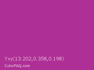 Yxy 13.202,0.358,0.198 Color is a normal magenta color and the nearest color is Fandango #b53389. Hex code #ae2f95 and RGB value is rgb(174,47,149). In RGB color space, this color is composed of 68% red, 18% green, 58% blue, In CMYK color space, this color is composed of 0% cyan, 73% magenta, 14% yellow , 32% black , In HSL color space, this color has a hue angle of 312° , 57% saturation and 43% lightness.