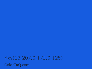 Yxy 13.207,0.171,0.128 Color is a normal blue color and the nearest color is Bright Navy Blue #1974d2. Hex code #165ce0 and RGB value is rgb(22,92,224). In RGB color space, this color is composed of 9% red, 36% green, 88% blue, In CMYK color space, this color is composed of 90% cyan, 59% magenta, 0% yellow , 12% black , In HSL color space, this color has a hue angle of 219° , 82% saturation and 48% lightness.
