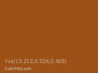 Yxy 13.212,0.524,0.403 Color is a normal orange color and the nearest color is Hawaiian Tan #9d5616. Hex code #9e5116 and RGB value is rgb(158,81,22). In RGB color space, this color is composed of 62% red, 32% green, 9% blue, In CMYK color space, this color is composed of 0% cyan, 49% magenta, 86% yellow , 38% black , In HSL color space, this color has a hue angle of 26° , 76% saturation and 35% lightness.