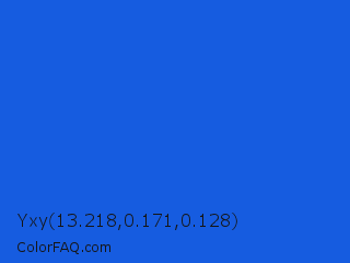 Yxy 13.218,0.171,0.128 Color is a normal blue color and the nearest color is Bright Navy Blue #1974d2. Hex code #165ce0 and RGB value is rgb(22,92,224). In RGB color space, this color is composed of 9% red, 36% green, 88% blue, In CMYK color space, this color is composed of 90% cyan, 59% magenta, 0% yellow , 12% black , In HSL color space, this color has a hue angle of 219° , 82% saturation and 48% lightness.