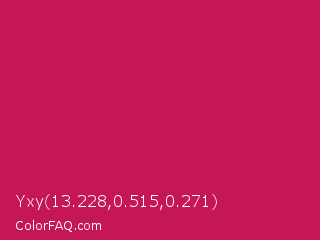 Yxy 13.228,0.515,0.271 Color is a normal rose color and the nearest color is Rose Red #c21e56. Hex code #c51758 and RGB value is rgb(197,23,88). In RGB color space, this color is composed of 77% red, 9% green, 35% blue, In CMYK color space, this color is composed of 0% cyan, 88% magenta, 55% yellow , 23% black , In HSL color space, this color has a hue angle of 338° , 79% saturation and 43% lightness.