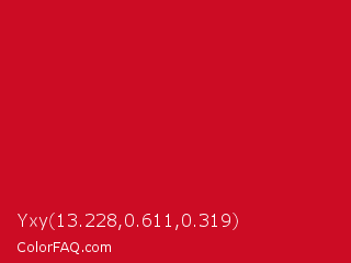 Yxy 13.228,0.611,0.319 Color is a normal red color and the nearest color is Lava #cf1020. Hex code #cc0c24 and RGB value is rgb(204,12,36). In RGB color space, this color is composed of 80% red, 5% green, 14% blue, In CMYK color space, this color is composed of 0% cyan, 94% magenta, 82% yellow , 20% black , In HSL color space, this color has a hue angle of 353° , 89% saturation and 42% lightness.