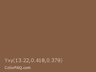 Yxy 13.22,0.418,0.379 Color is a normal orange color and the nearest color is Coyote Brown #81613c. Hex code #855d43 and RGB value is rgb(133,93,67). In RGB color space, this color is composed of 52% red, 36% green, 26% blue, In CMYK color space, this color is composed of 0% cyan, 30% magenta, 50% yellow , 48% black , In HSL color space, this color has a hue angle of 24° , 33% saturation and 39% lightness.