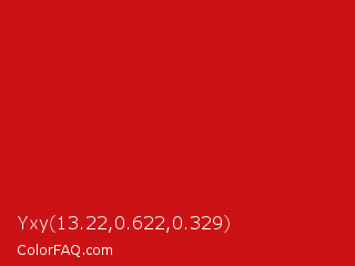 Yxy 13.22,0.622,0.329 Color is a normal red color and the nearest color is Venetian Red #c80815. Hex code #cb1315 and RGB value is rgb(203,19,21). In RGB color space, this color is composed of 80% red, 7% green, 8% blue, In CMYK color space, this color is composed of 0% cyan, 91% magenta, 90% yellow , 20% black , In HSL color space, this color has a hue angle of 359° , 83% saturation and 44% lightness.
