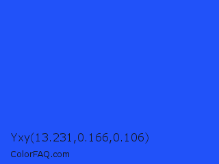 Yxy 13.231,0.166,0.106 Color is a normal blue color and the nearest color is Palatinate Blue #273be2. Hex code #2152f9 and RGB value is rgb(33,82,249). In RGB color space, this color is composed of 13% red, 32% green, 98% blue, In CMYK color space, this color is composed of 87% cyan, 67% magenta, 0% yellow , 2% black , In HSL color space, this color has a hue angle of 226° , 95% saturation and 55% lightness.