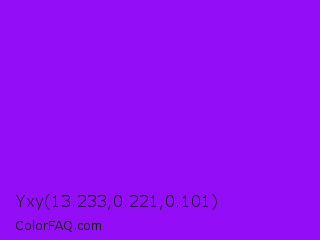 Yxy 13.233,0.221,0.101 Color is a normal purple color and the nearest color is Electric Violet #8f00ff. Hex code #930ef7 and RGB value is rgb(147,14,247). In RGB color space, this color is composed of 58% red, 5% green, 97% blue, In CMYK color space, this color is composed of 40% cyan, 94% magenta, 0% yellow , 3% black , In HSL color space, this color has a hue angle of 274° , 94% saturation and 51% lightness.