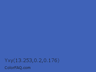 Yxy 13.253,0.2,0.176 Color is a normal blue color and the nearest color is San Marino #456cac. Hex code #3f62b8 and RGB value is rgb(63,98,184). In RGB color space, this color is composed of 25% red, 38% green, 72% blue, In CMYK color space, this color is composed of 66% cyan, 47% magenta, 0% yellow , 28% black , In HSL color space, this color has a hue angle of 223° , 49% saturation and 48% lightness.