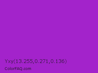 Yxy 13.255,0.271,0.136 Color is a normal purple color and the nearest color is Dark Orchid #9932cc. Hex code #a323cb and RGB value is rgb(163,35,203). In RGB color space, this color is composed of 64% red, 14% green, 80% blue, In CMYK color space, this color is composed of 20% cyan, 83% magenta, 0% yellow , 20% black , In HSL color space, this color has a hue angle of 286° , 71% saturation and 47% lightness.