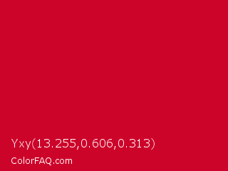 Yxy 13.255,0.606,0.313 Color is a normal red color and the nearest color is Vivid Crimson #cc0033. Hex code #cd042a and RGB value is rgb(205,4,42). In RGB color space, this color is composed of 80% red, 2% green, 16% blue, In CMYK color space, this color is composed of 0% cyan, 98% magenta, 80% yellow , 20% black , In HSL color space, this color has a hue angle of 349° , 96% saturation and 41% lightness.