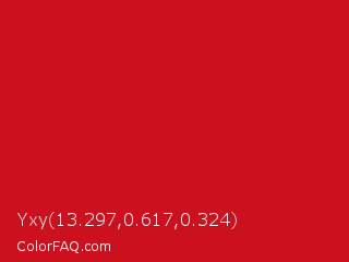 Yxy 13.297,0.617,0.324 Color is a normal red color and the nearest color is Lava #cf1020. Hex code #cc101d and RGB value is rgb(204,16,29). In RGB color space, this color is composed of 80% red, 6% green, 11% blue, In CMYK color space, this color is composed of 0% cyan, 92% magenta, 86% yellow , 20% black , In HSL color space, this color has a hue angle of 356° , 85% saturation and 43% lightness.