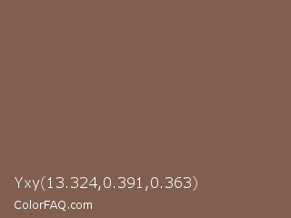 Yxy 13.324,0.391,0.363 Color is a normal orange color and the nearest color is Roman Coffee #795d4c. Hex code #805f4e and RGB value is rgb(128,95,78). In RGB color space, this color is composed of 50% red, 37% green, 31% blue, In CMYK color space, this color is composed of 0% cyan, 26% magenta, 39% yellow , 50% black , In HSL color space, this color has a hue angle of 20° , 24% saturation and 40% lightness.