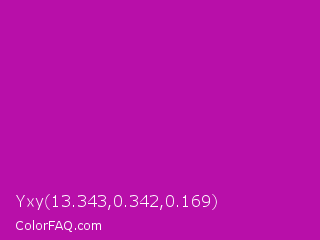 Yxy 13.343,0.342,0.169 Color is a normal magenta color and the nearest color is Heliotrope Magenta #aa00bb. Hex code #b80fa9 and RGB value is rgb(184,15,169). In RGB color space, this color is composed of 72% red, 6% green, 66% blue, In CMYK color space, this color is composed of 0% cyan, 92% magenta, 8% yellow , 28% black , In HSL color space, this color has a hue angle of 305° , 85% saturation and 39% lightness.