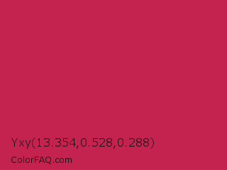 Yxy 13.354,0.528,0.288 Color is a normal rose color and the nearest color is Maroon Flush #c32148. Hex code #c3234e and RGB value is rgb(195,35,78). In RGB color space, this color is composed of 76% red, 14% green, 31% blue, In CMYK color space, this color is composed of 0% cyan, 82% magenta, 60% yellow , 24% black , In HSL color space, this color has a hue angle of 344° , 70% saturation and 45% lightness.