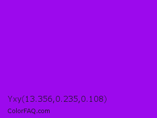 Yxy 13.356,0.235,0.108 Color is a normal purple color and the nearest color is Vivid Violet #9f00ff. Hex code #9c09ed and RGB value is rgb(156,9,237). In RGB color space, this color is composed of 61% red, 4% green, 93% blue, In CMYK color space, this color is composed of 34% cyan, 96% magenta, 0% yellow , 7% black , In HSL color space, this color has a hue angle of 279° , 93% saturation and 48% lightness.