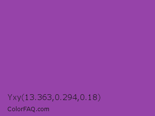 Yxy 13.363,0.294,0.18 Color is a normal purple color and the nearest color is Purpureus #9a4eae. Hex code #9643a9 and RGB value is rgb(150,67,169). In RGB color space, this color is composed of 59% red, 26% green, 66% blue, In CMYK color space, this color is composed of 11% cyan, 60% magenta, 0% yellow , 34% black , In HSL color space, this color has a hue angle of 289° , 43% saturation and 46% lightness.